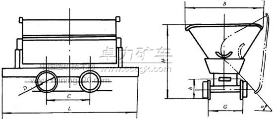 型號 | 容積 m3 | 裝載重量 | 軌距 mm | 外形尺寸 | 軸距 | 輪距 | 牽引高 | 額定 牽引力 kN | 卸載角 α (°) | 車體 重量 kg | |||