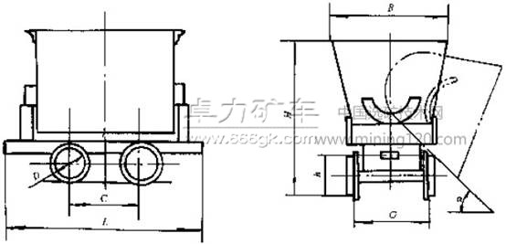 3.1 礦車型式為翻斗式,按車箱形狀分V型和U型。V型車一般以運輸松散密度在1800kg/m3以下的物料為主,多用于地表作業(yè);U型車一般以運輸松散密度在2500kg/m3以下的物料為主,多用于井下作業(yè)。