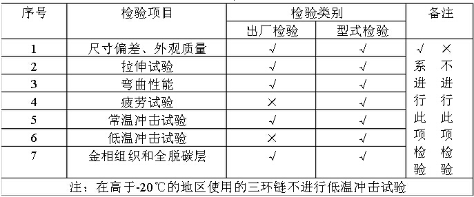 12.4.2 表4中的序號(hào)2、3、4、和5為主要項(xiàng)目,主要項(xiàng)目的允許復(fù)檢項(xiàng)目數(shù)為 1項(xiàng),經(jīng)加倍數(shù)量復(fù)檢仍有一掛 (件)不合格,則判定該批三環(huán)鏈為不合格。