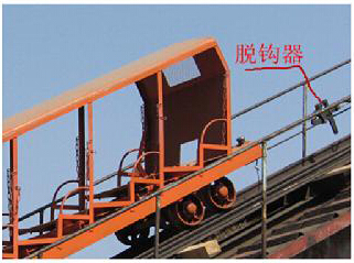(2)這時可將列車提到ST距離,然后便可打開脫鉤器,這時列車自由下跑回到ST距離,閉鎖器φ6鋼絲繩繃緊,人車繼續(xù)下行,楔子抽出,閉鎖器打開。主拉桿在彈簧作用下回彈,制動器動作,插爪下落實現(xiàn)制動。