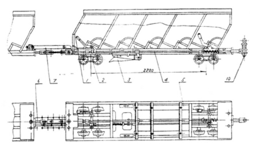 整個列車由兩節(jié)頭車及一定數(shù)量的掛車和尾車用三環(huán)鏈串連組列而成。由提升機(jī)牽引列車之首的S1頭車運行。每節(jié)頭車上設(shè)有開動裝置,帶有一個輪對的制動裝置、緩沖裝置,帶有一個輪對的滑動棚架、閉鎖裝置等。兩節(jié)頭車的主拉桿用Φ18×64的7節(jié)環(huán)形鏈連接起來,從而使兩個結(jié)構(gòu)獨立的開動裝置的撞塊能同時打開獨立安在兩臺頭車上的制動裝置達(dá)到同步抓捕。四對抱爪同時定點抓住鋼軌后,掛車連同頭車滑動棚架一同因緩沖器迅速吸收了運動能量而減速下滑,頭車滑動棚架下的輪對與制動架下邊的輪對,兩軸拉開的距離就是緩沖距離,最大達(dá)1.4米。