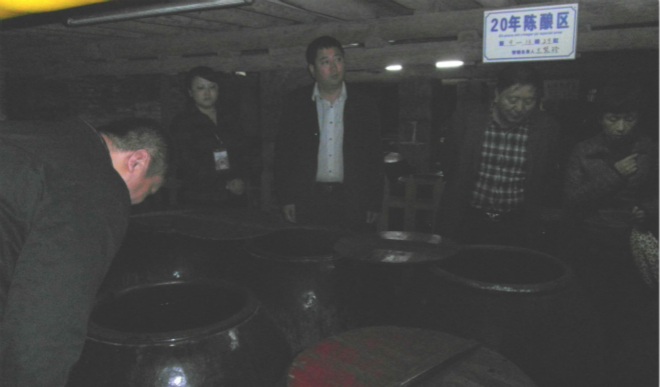 在參觀完紅酒發(fā)酵過程后周處長一行人來到了我們的窖藏車間,一進地窖撲香而來的醋味和數(shù)量眾多的窖缸讓周處長等領(lǐng)導(dǎo)嘖嘖稱奇。公司講解員詳細(xì)介紹了窖藏車間的由來及釀造技藝。“永春老醋窖藏車間始建于1953年,為永春釀造廠創(chuàng)始之時,模擬民間家傳老醋的釀制條件而建。主體為木質(zhì)結(jié)構(gòu)樓房,底層為半地下室環(huán)境終年恒溫恒濕;所有的醋缸都是當(dāng)時從民間收集而來,數(shù)量超過3000個,至今已有五十多年的歷史。像這樣采用陶制醋缸在半地下室的環(huán)境中按照傳統(tǒng)工藝釀醋的在全國只有永春老醋一家,其他老醋即使有醋缸也用純手工釀造,但他們都沒有這種半地下室的發(fā)酵環(huán)境。所以永春老醋的窖藏車間是全國唯一獨有的。采用陶制醋缸有利于微生物菌群的生長,恒溫恒濕的環(huán)境更能使醋酸菌充分發(fā)酵,再加上分期分批添加紅曲酒到不同的醋缸轉(zhuǎn)酸,不同年份的醋缸逐年交替分割去醋的陳釀方法以及每天專人純手工地攪拌、分割和補料方式。從而形成了永春老醋秉承傳統(tǒng)釀造工藝的獨到優(yōu)勢,所以永春老醋歷經(jīng)數(shù)十年流轉(zhuǎn)陳釀,酸香醇厚,品味精絕,乃醋中極品,值得典藏。.jpg)