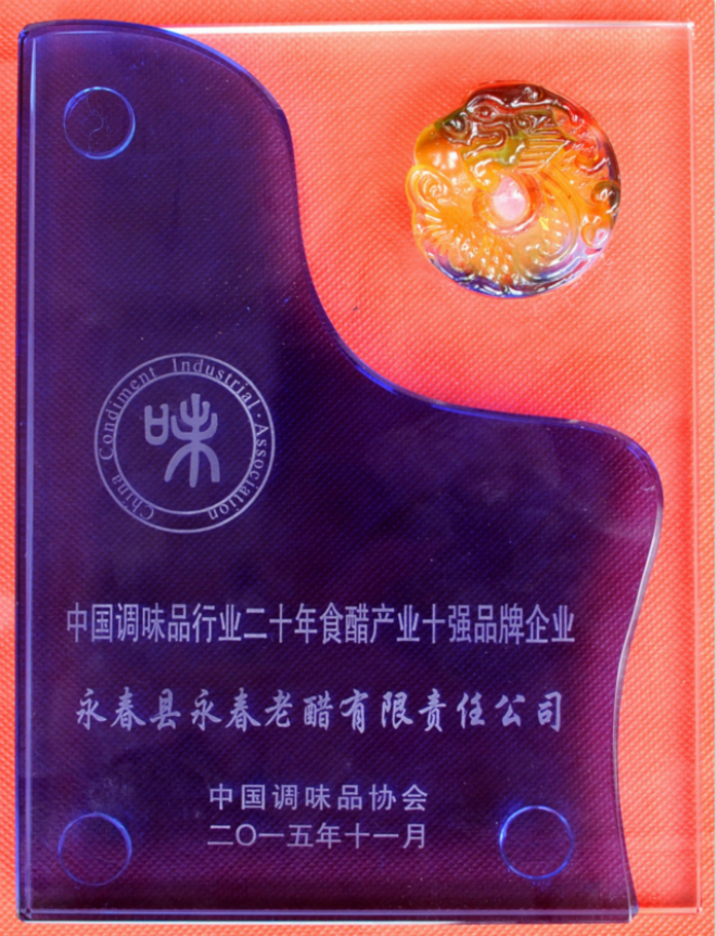 會議上,對行業(yè)20年來做出突出貢獻的企業(yè)、企業(yè)家代表進行了表彰授獎。永春縣永春老醋有限責任公司在會上榮獲 了“中國調味品行業(yè)20年食醋十強品牌企業(yè)”的榮譽稱號。