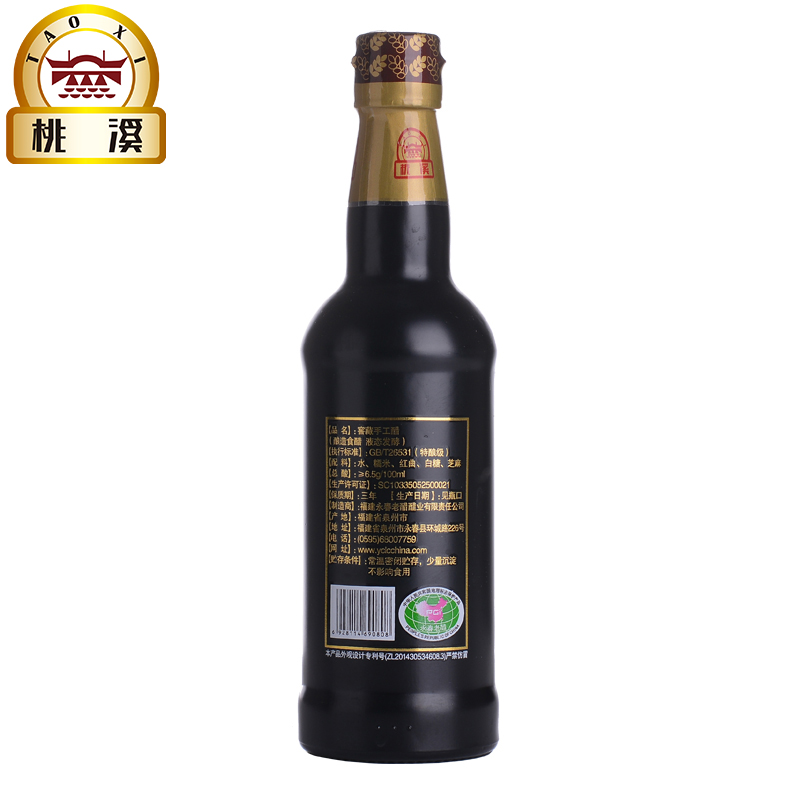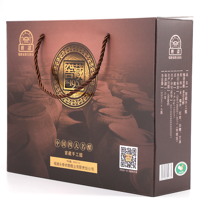 選用優(yōu)質(zhì)糯米、紅曲、芝麻、原產(chǎn)地水源等為原料,傳承千年獨(dú)特釀造工藝(液態(tài)深層發(fā)酵),純糧釀造;在半地下室的窖藏車間里,按照古法釀造工藝,純手工制醋,經(jīng)年累月,邊發(fā)酵邊陳釀,平均陳釀時(shí)間十年起,酸度6.5左右。故產(chǎn)出的老醋香味醇厚,濃酸微甜,零添加劑,回味悠長(zhǎng),是永春老醋中的精品。采用精美的禮盒包裝,適合送禮親朋,有禮有面!